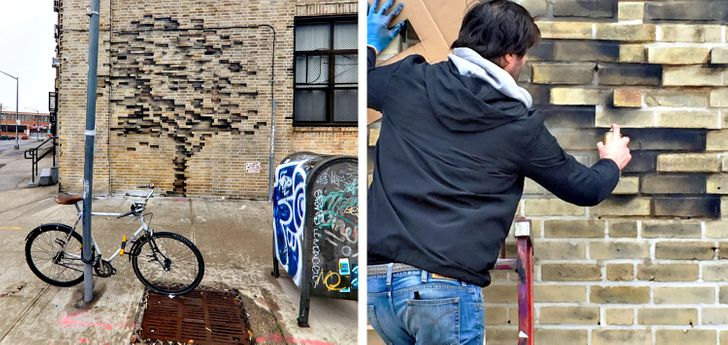Уличен сликар прави циглите на овие куќи да изгледаат како да пропаднале во облик на дрвја.