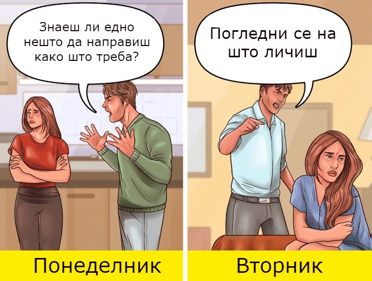 По непријатна конфронтација, насилникот понекогаш ќе го натера својот партнер да се чувствува виновен за ситуацијата. Вашиот партнер може да ме натера да се чуствувате одговорно за неговите постапки велејќи ви дека вие сте виновни што сте го натерале на тоа.