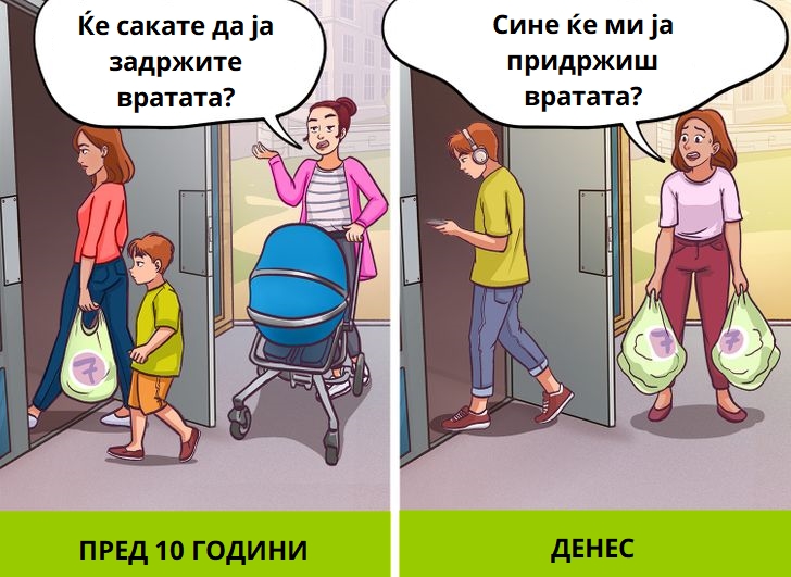 Замислете ситуација: една жена се обидува да турне количка со бебе низ прагот во продавница. Или човек доаѓа до вратата со полни торби во рацете. Дали ќе помогнете со држење на вратата? А вашето дете? Ако двата одговори се „не“, тоа е повик за будење, велат експертите за бонтон.