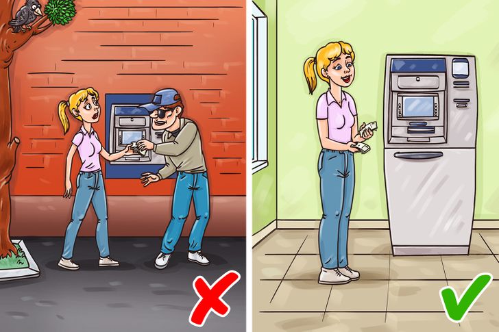Ако треба да користите банкомат, изберете го оној кој се наоѓа во затворен објект. Тоа е затоа што банкоматите во хотелите и рестораните имаат помалку пари и имаат помала веројатност да бидат цел на крадците.