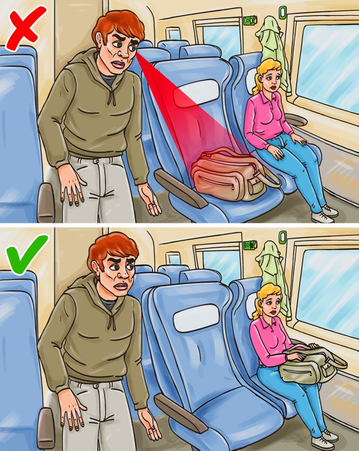 Кога крадец го прави ова, тоа е затоа што тие ја скенираат околината за торби без надзор или за оние што можат лесно да се фатат кога излегуваат на следната станица. Исто така, внимавајте на оние кои прават мали движења со своите раце, па дури и со нозете. Тие ќе го искористат ова како вид на телесно одвлекување на внимание, за да не видите кога ќе зграпчат нешто.