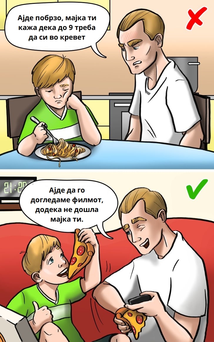 Добро е ако тато ги следи сите упатства на мама. Но, уште подобро е ако тој направи чекор напред и преземе иницијатива. И дури и ако оваа иницијатива не е целосно „точна“ – доцна гледање филм во прегратка на каучот или јадење пица во несоодветно време, но тоа ќе биде лично време на детето и таткото и можеби, нивната тајна.