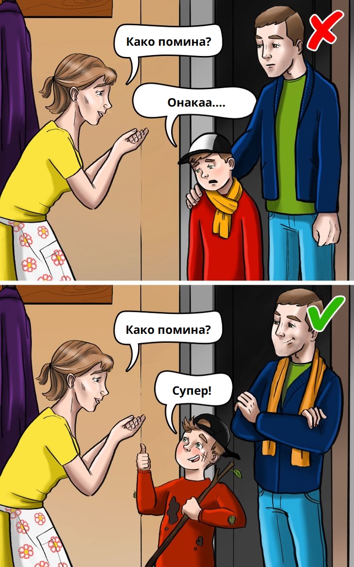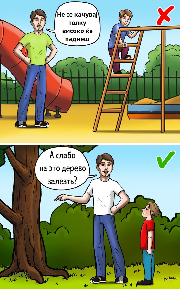 Добриот татко не е оној што го штити детето од вообичаените игри од детството со предупредувања „ќе паднеш“ или „ќе се повредиш“. Напротив, вистинскиот татко го учи детето на храброст и разбирање на ризиците. Наместо жалење „зошто би оделе таму, опасно е“, тој самиот ќе преземе иницијатива, ќе го научи детето да ги надминува пречките и да ги прифаќа последиците од грешките.