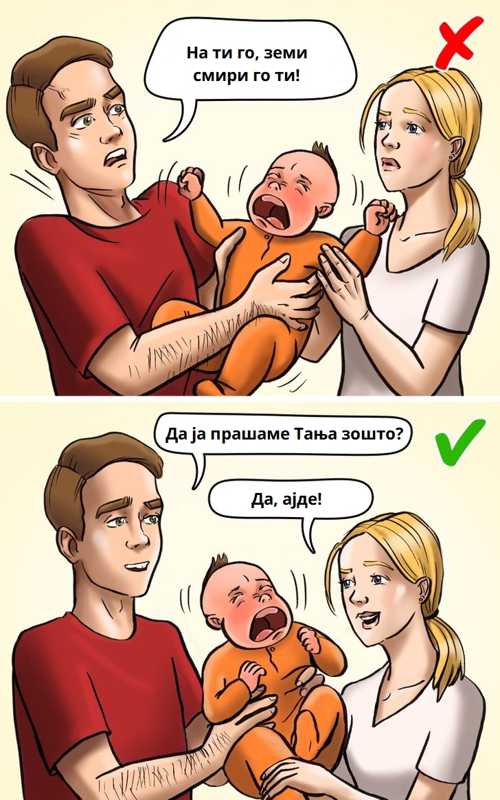 Со правилен развој на настаните, таткото учествува во животот на детето на еднаква основа со мајката и разбира дека неговата сопруга исто така не е свесна зошто бебето се чувствува на одреден начин или прави одредени работи.