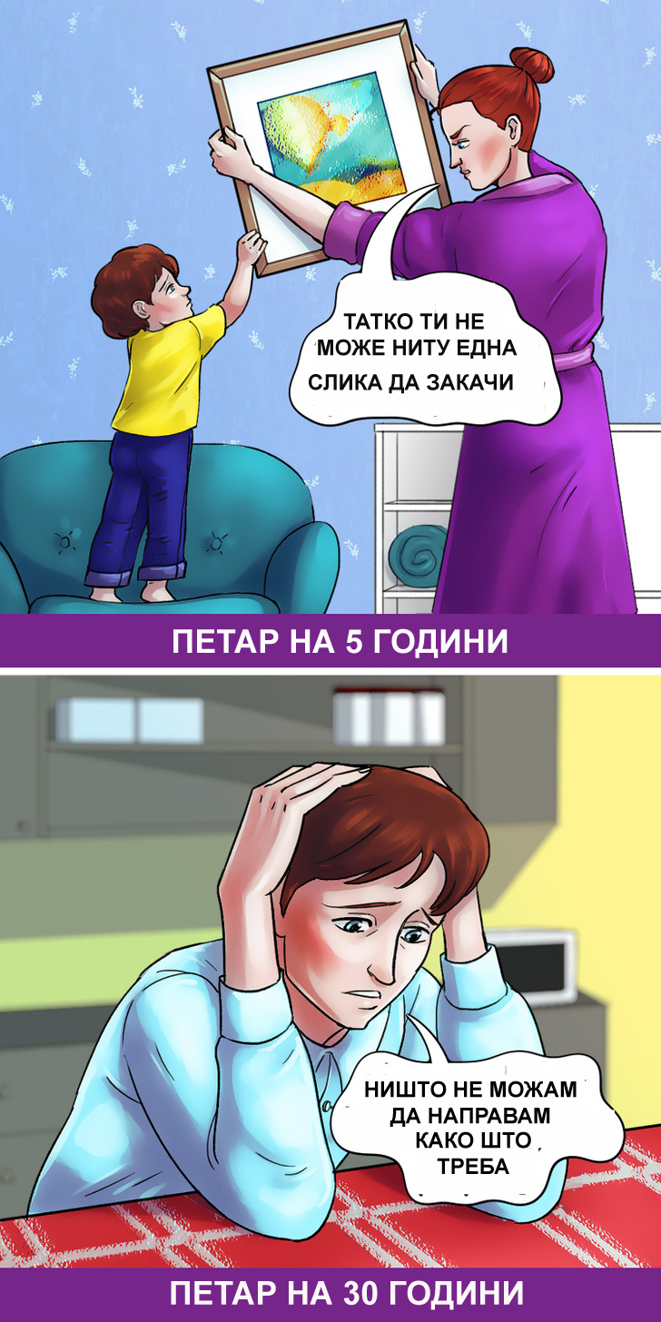 Секој пат кога еден од родителите ќе го исмева или критикува другиот, детето мора да направи непријатен избор: да се согласи со нив, да го заштити другиот родител или да молчи. И ако детето почне да верува дека нивниот татко или мајка не се способни за ништо, може да ја изгуби вербата во себе и во својата насока во животот.
