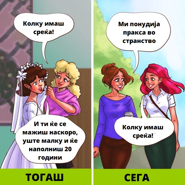 Беше навистина важно младите жени од претходните генерации да се венчаат што е можно поскоро. Но, денес, нема да изненадите никого со тоа што ќе се омажите на 30, па дури и на 50 години. Жените претпочитаат да ги градат своите кариери, да купат свој дом и прво да патуваат низ светот, а дури потоа ќе размислуваат за семејниот живот. Затоа добрата понуда за работа не е помалку важна од предлогот за брак во современиот свет.