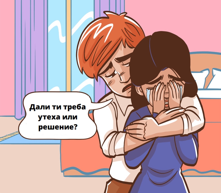 Емоционалната поддршка што ја давате преку активно слушање е исто толку важна, ако не и поважна од понудата на практични решенија. Борете се со нагонот секогаш да сакате да бидете херој кој ги решава проблемите на вашиот партнер и бидете најдобриот пријател кој ги признава нивните проблеми и ги уверува дека на крајот сè ќе биде во ред.