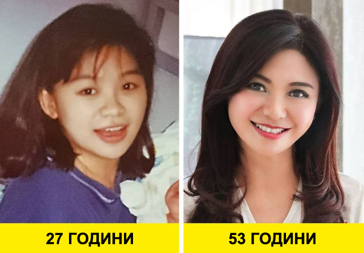 Една од најпопуларните блогерки во Индонезија, која изгледа како 35 кога има 53 години, ја откри својата тајна на младоста. Колку е постара, толку е посреќна. Среќата помага да се одржи внатрешната и надворешната убавина. Насмевнете се повеќе и сакајте се себеси.