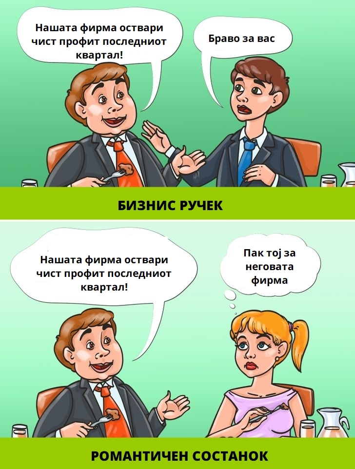 Главниот шеф е постојано на телефон. На семејните собири постојано зборуваат за корисни познанства. На состанок не даваат комплименти, туку бројки.