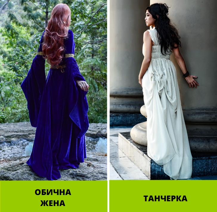 Дури и малите разлики во должината на одредени парчиња облека можеле да укажуваат на статусот на носителот. Облеката до глуждовите со висока кружна јака и тесни ракави до зглобот кажувале дека станува збор за обична жена. Несоголувањето на раката над зглобот било знак на скромност во Византија. Но, фустаните со кратки или без ракави и тесни широки ремени ја издавале танчерката.