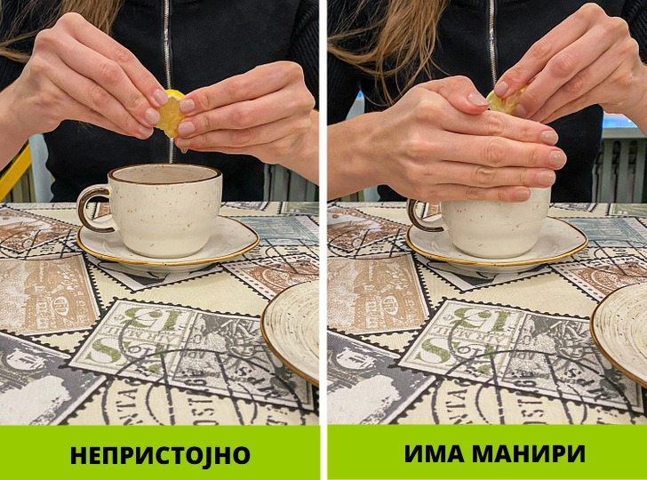 Тешко е да се одолее на искушението да исцедите парче лимон за да му дадете на вашиот чај нијанса на цитрус. Меѓутоа, честопати, кога го правиме тоа, не размислуваме за оние околу нас. Правилата за добри манири велат: исцедете го лимонот со едната рака додека го покривате со другата додека го стискате во чашата, за случајно да не прснете во окото на вашиот пријател од другата страна на масата.