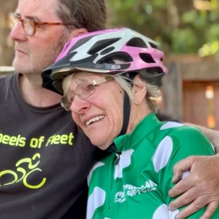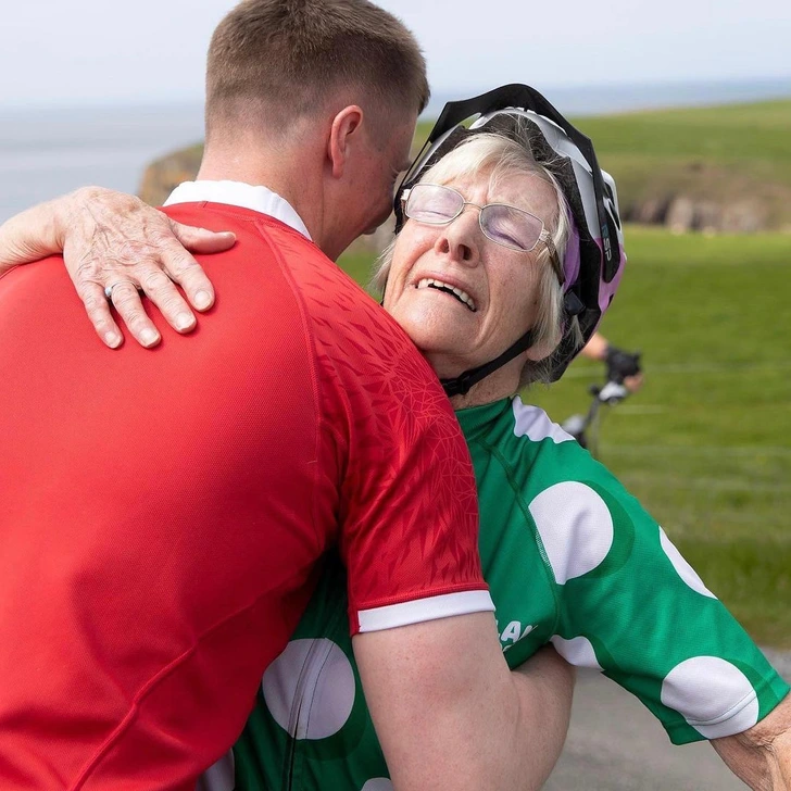 Мејвис го започна своето велосипедско патување во Мул оф Галовеј, а на целта ја пречекаа расположените фанови и нејзиниот внук, кои ја прегрнаа.