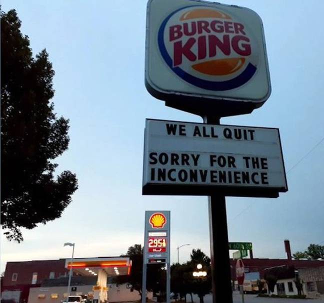 Сосема е нормално луѓето да мечтаат за поинаков пат во кариерата, но малкумина даваат отказ заедно со колегите во истиот ден. Условите за работа во Бургер Кинг во Небрска, САД, ги натераа вработените да заминат „со стил“ , оставајќи интересна порака до повисокото раководство.
