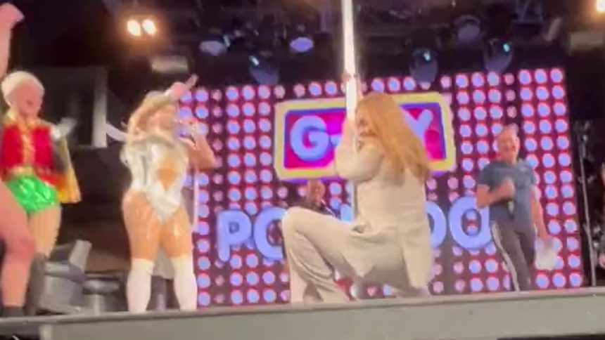Сето ова беше снимено од посетителите на клубот додека таа танцуваше на хитот „It’s Raining Men“ и малкумина можеа да поверуваат дека гледаат музичка дива која имаше цивилизиран настап на шоуто на Греам Нортон претходната вечер по огромниот успех на BRIT Awards.