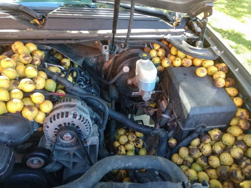 Бил Фишер го остави својот автомобил паркиран неколку дена покрај црно оревче во Северна Дакота, САД. За ова време, верверицата ги наполнила сите шуплини на автомобилот со плодови од црн орев со големина на лимон. Човекот мораше да ги отстрани браниците од автомобилот и темелно да го исчисти просторот под хаубата. Вкупно, верверицата скри 42 галони ореви (190,94 литри), очигледно подготвувајќи резерви за зимата. Вредна верверица.