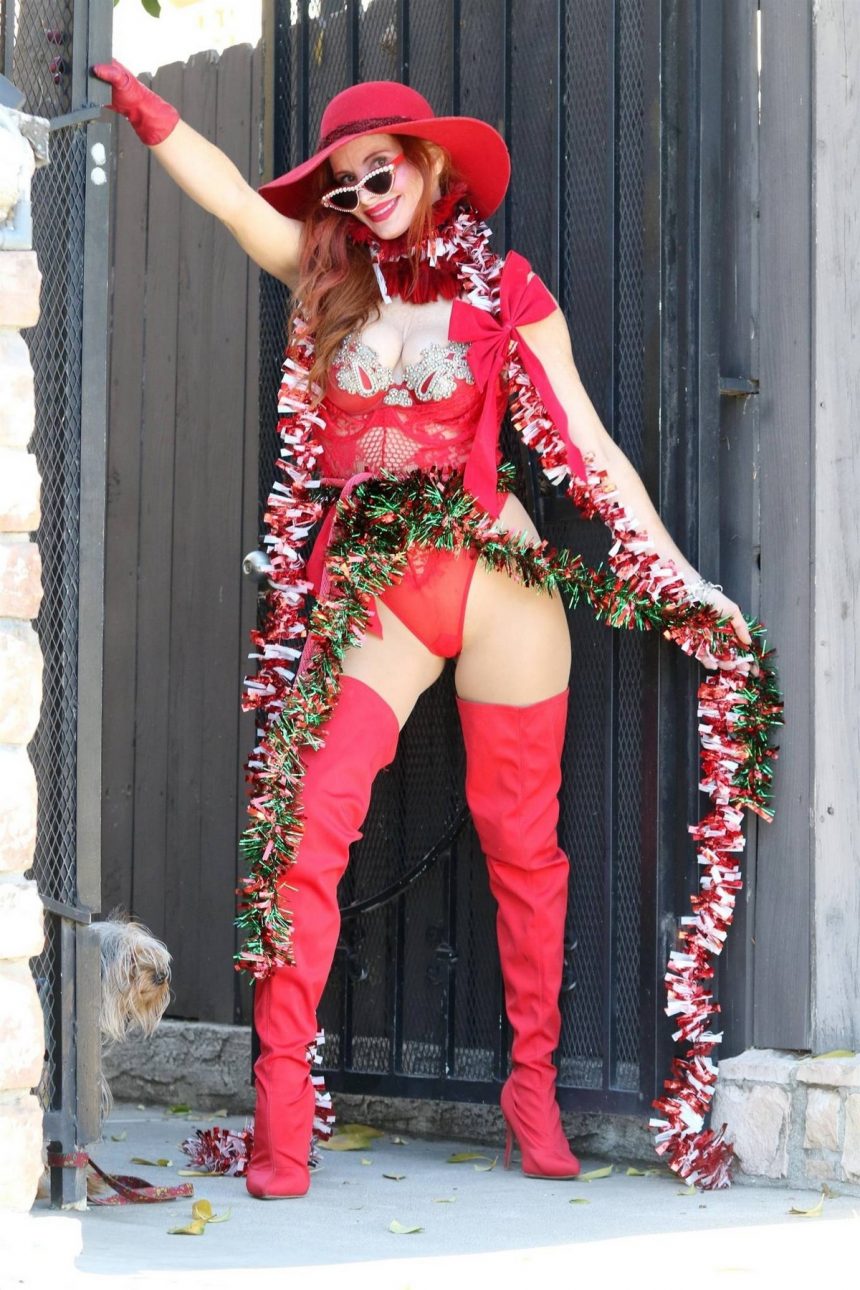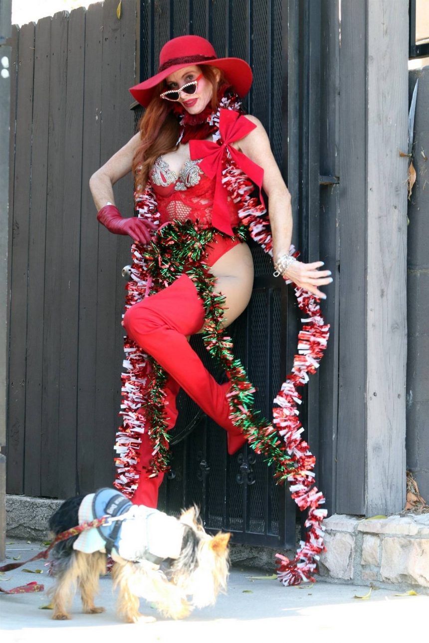 51-годишната американска манекенка и актерка Фиби Прајс на улица во Лос Анџелес носи црвена облека во духот на Божиќ.