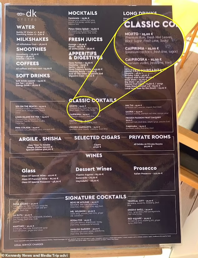 Џесика Јарнал (31) и Адам Хагаун (30) од Монтана, велат дека верувале дека коктелите чинат по 27 долари кога нарачале во барот DK Oyster на плажата Платис Гиалос во Миконос.