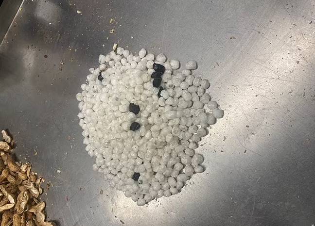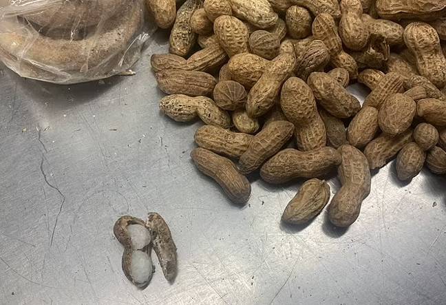 Откако ги отвориле лушпите, внатре била пронајдена „супстанца од бел кристал“, која подоцна била тестирана и потврдена како метамфетамин.