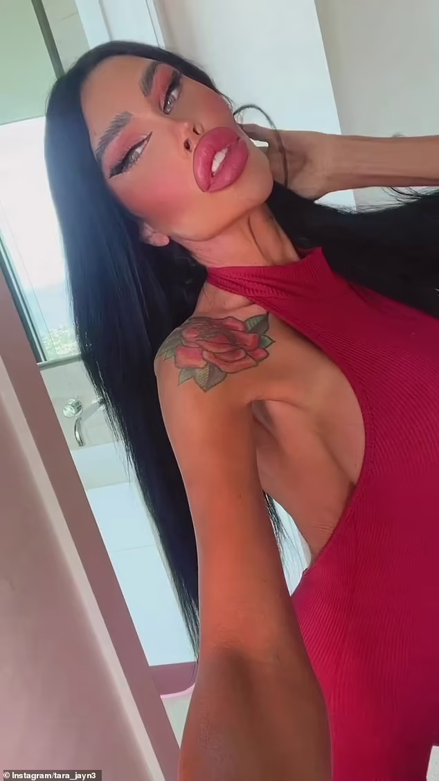 Медицинската сестра од Мелбурн, Тара Џејн која се појави во хит американското телевизиско шоу „Botched“, ја покажа својата екстремно зголемена уста и хируршки подобрените гради во празнично црвено фустанче, додека позираше за видеото со селфи.