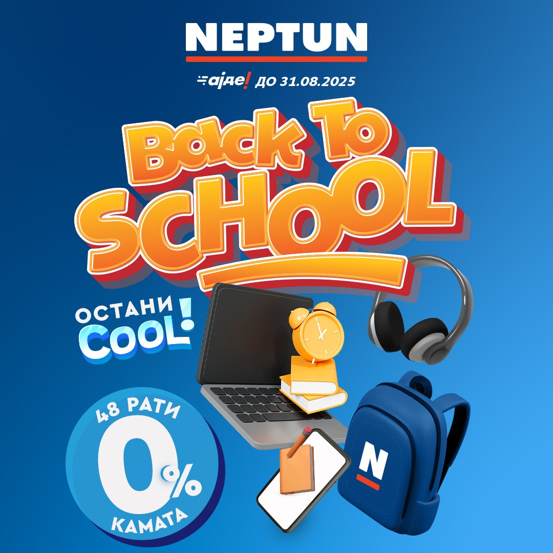 На 19 август започна Back to School кампањата на Нептун, која ќе трае до 31 август 2025 година. Потрошувачите имаат на располагање голем асортиман на производи – лаптопи, персонални компјутери, таблети, смартфони, слушалки, паметни часовници и аксесоари, достапни со специјални услови на купување до 48 рати без камата.