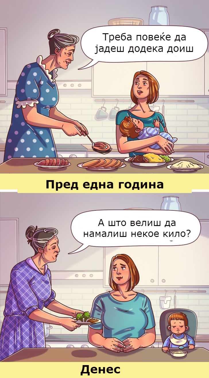 Многу постари роднини со добра намера ги советуваат доилките да јадат повеќе за мајчиното млеко да биде погусто, но подоцна почнуваат да се жалат дека жената се здебелила. Треба да има рамнотежа во сè што правиме. Не треба да јадете за двајца ако не сакате, во спротивно, можеби нема да успеете да се препознаете во огледало по неколку години.
