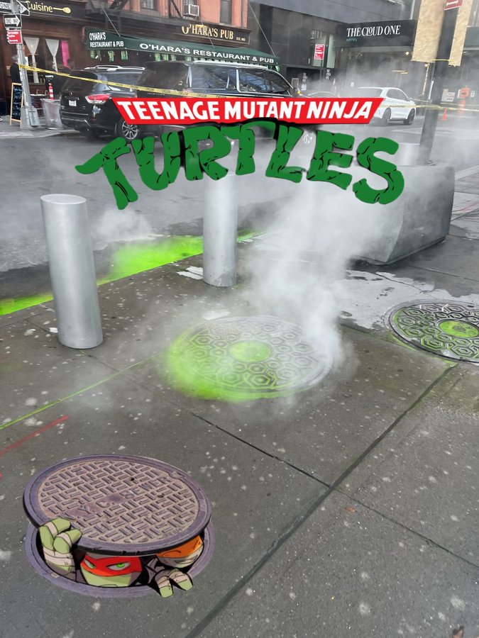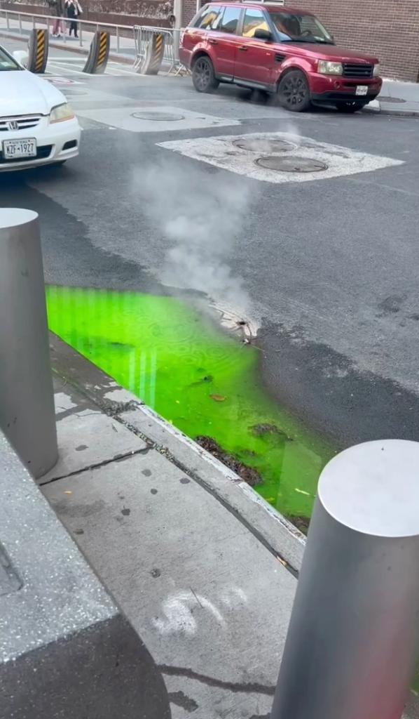 Корисник на X од Менхетен прв го испрати феноменот вирален во четвртокот, објавувајќи фотографија и видео од течноста со светли нијанси што излегува од под тротоарот.