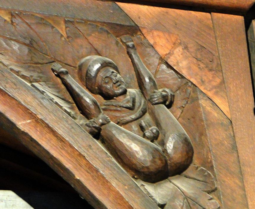 Резбата прикажува гол човек кој ги држи нозете во воздух, покажувајќи ги неговите гениталии, дефинитивно контроверзен избор за таква религиозна локација.