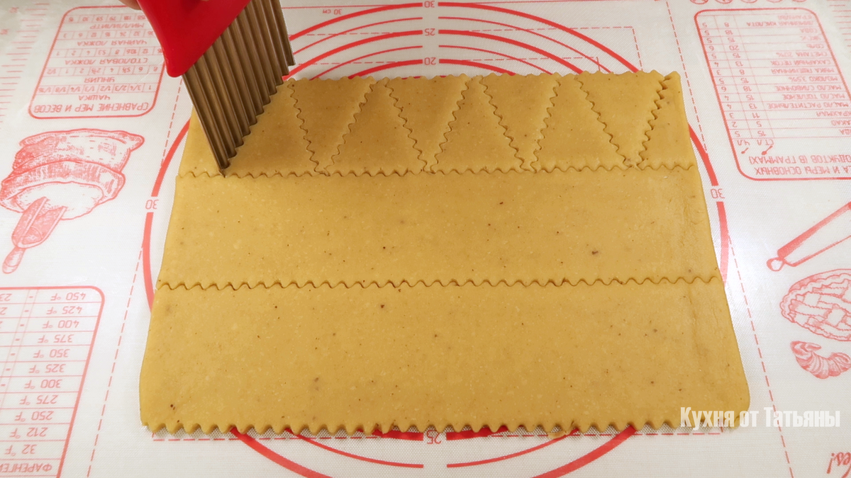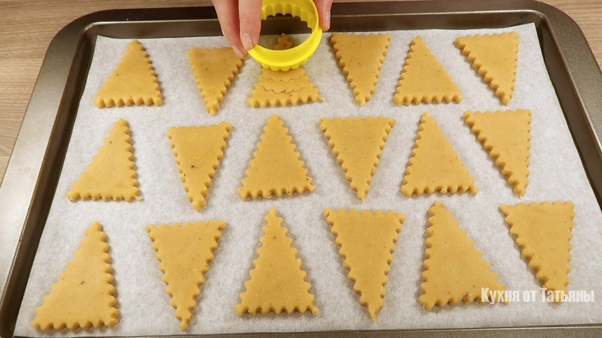 Тестото се развлекува во правоаголен лист со дебелина од околу 3-4 милиметри. Со заоблен нож се сече на ленти, а секоја лента потоа на триаголници. Основата на триаголникот ја прави малку помала од страниците – така колачето навистина личи на елкичка. Загрејте ја рерната на 180 степени. Наредете ги триаголниците на хартија за печење. За декоративен изглед, направете шара со мал калап за колачиња со брановидни рабови. Печете ги околу 10 минути – но времето може да варира, зависи од вашата рерна.