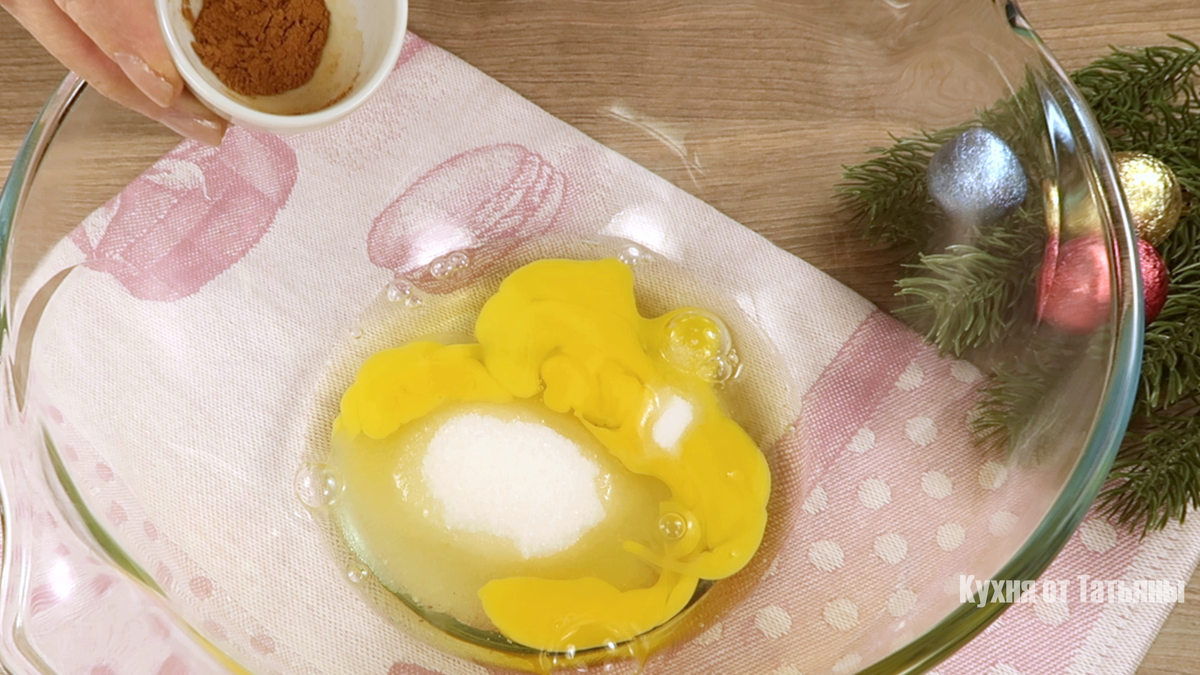 Во еден сад за мешање додадете две јајца, шеќер, малку сол, цимет и ѓумбир. Добро измешајте. Потоа истурете растително масло без мирис и додадете мед. Повторно промешајте. Овој букет на ароми ќе му даде препознатлив празничен карактер на тестото.