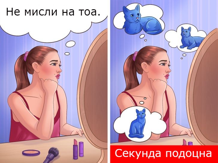 Повеќето од нас веројатно имаме мисли што не сакавме да ги имаме, можеби несреќен настан или срамен момент. Како што се обидуваме да ги потиснеме тие мисли, толку повеќе ни доаѓаат на ум. Постои вистинско име за ова, познато како теорија на ироничен процес. Класичен пример е ако си кажеме да не размислуваме за сина мачка, сината мачка ќе биде единственото нешто во нашиот ум.