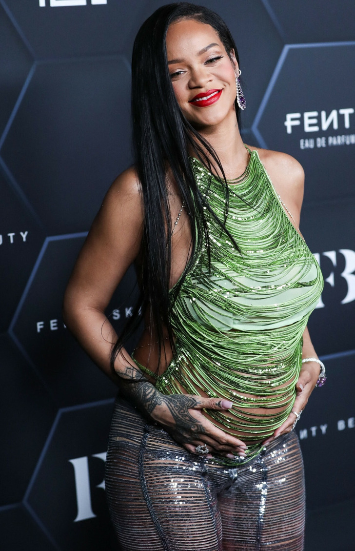 Во 2022 година, Ријана се појави на страниците на многу списанија откако создаде нов породилен стил. Ѕвездата ја истакна својата бременост со различни разголени комбинации, како оваа направена од светкави конци.