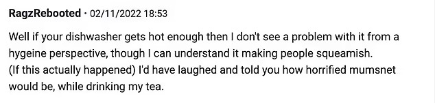 Друг додаде: „Па, ако вашата машина за миење садови се загрее доволно, тогаш не гледам проблем со неа од хигиенска перспектива, иако можам да разберам зошто тоа би им дошло на луѓето одвратно“.
