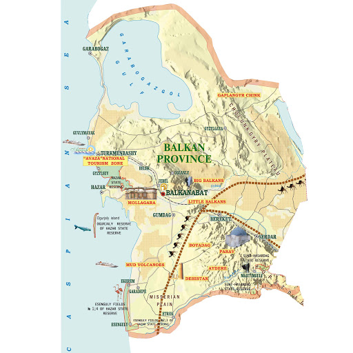 Покрај неговите касписки брегови, Балканскиот регион го вклучува островот Огурја Ада, најважниот остров во Туркменистан и еден од најголемите во Каспиското Море.