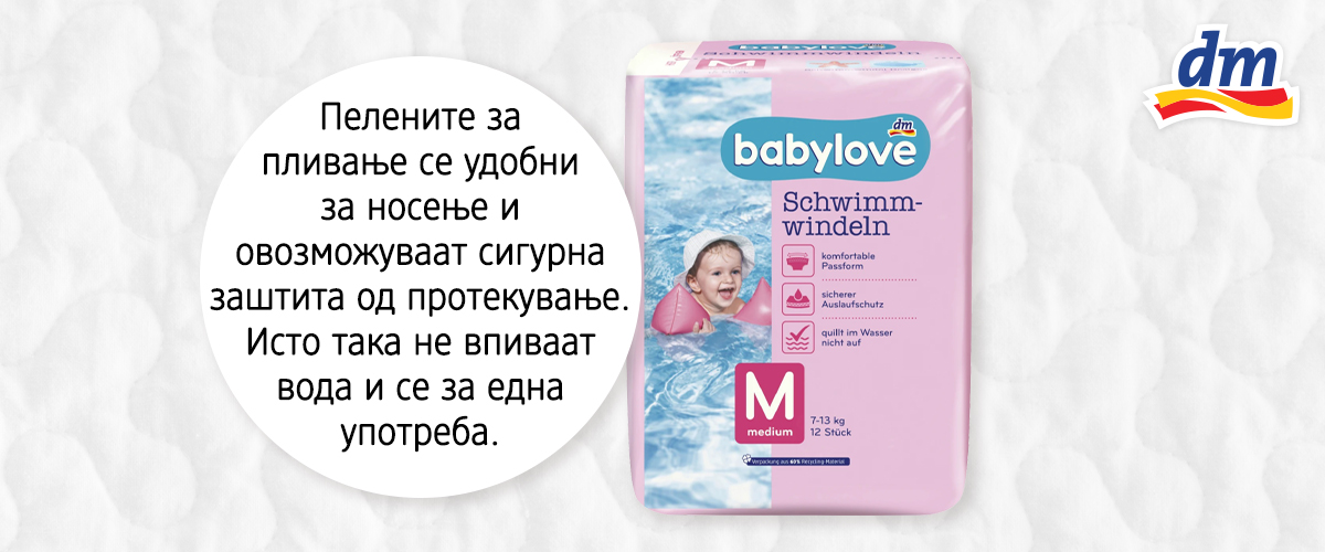 Дали знаете дека постојат babylove пелени за пливање со кои летниот одмор ќе ви помине без грижи? Фатете патот до најблиската dm дрогерија и добијте подарок со купување на babylove производите