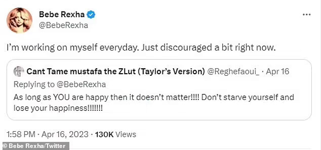 Потоа таа надополни со уште неколку твитови: „Кучката сака да јаде!“ „Работам на себе секој ден. Само сум малку обесхрабрена во моментов“.