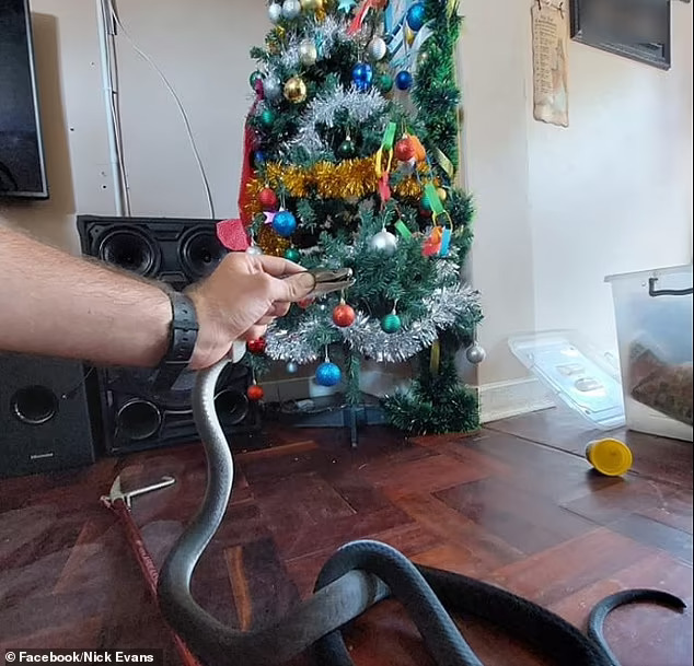 „Дедо Мраз ми остави божиќен подарок“, напиша ловецот на змии Ник Еванс во објава на „Фејсбук“ за инцидентот. Ова не е прв пат змија да се најде во неговиот дом.