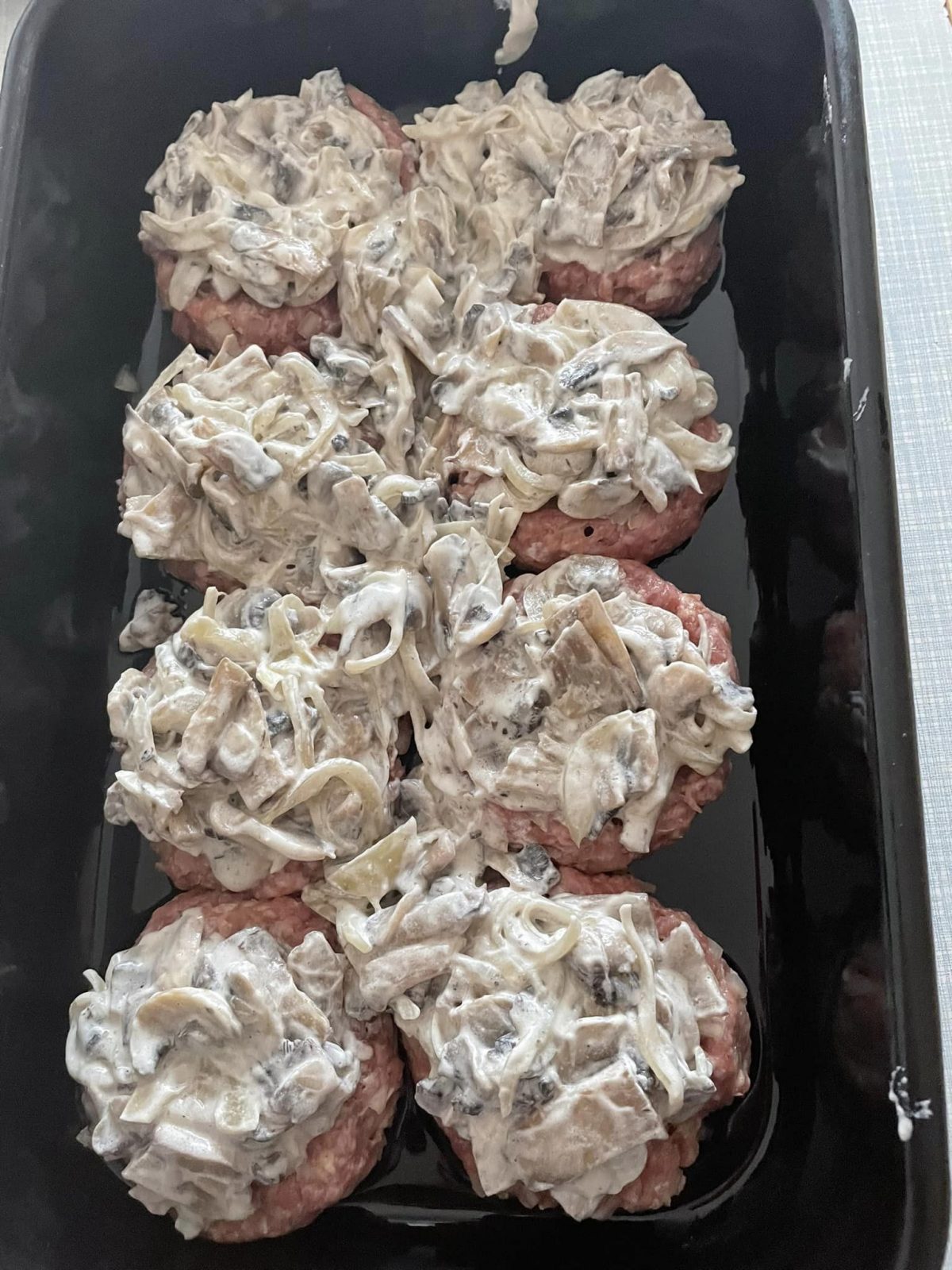 - Од смесата со мелено месо направете 8 подебели плескавици и ставете ги во тава подмачкана со масло. Со помош на лажица направете во нив вдлабнатина во која ќе ставите од филот со шампињони. Ако ви остане од филот ставете го помеѓу гнездата.