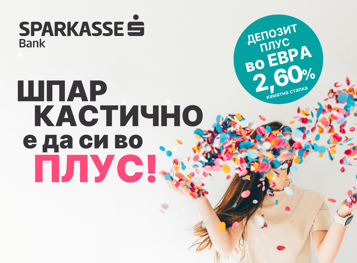 Штедењето е темел на личната и на семејната финансиска стабилност. Затоа, со „Депозит плус“ во евра, Шпаркасе Банка нуди штеден производ што е пред сè транспарентен, со загарантирани приноси за целиот период на орочување, достапен за секој клиент и со исклучително поволна фиксна каматна стапка. Штедењето во евра е особено атрактивно за граѓаните што сакаат преку своите заштеди да обезбедат стабилност во валута што е широко прифатена и користена во меѓународни трансакции.