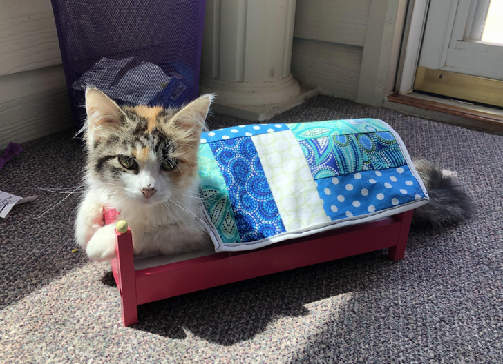 4. „Ќерка ми ужива да го става нашето маче во креветот на куклата, а се гледа по мачето дека му е супер…“