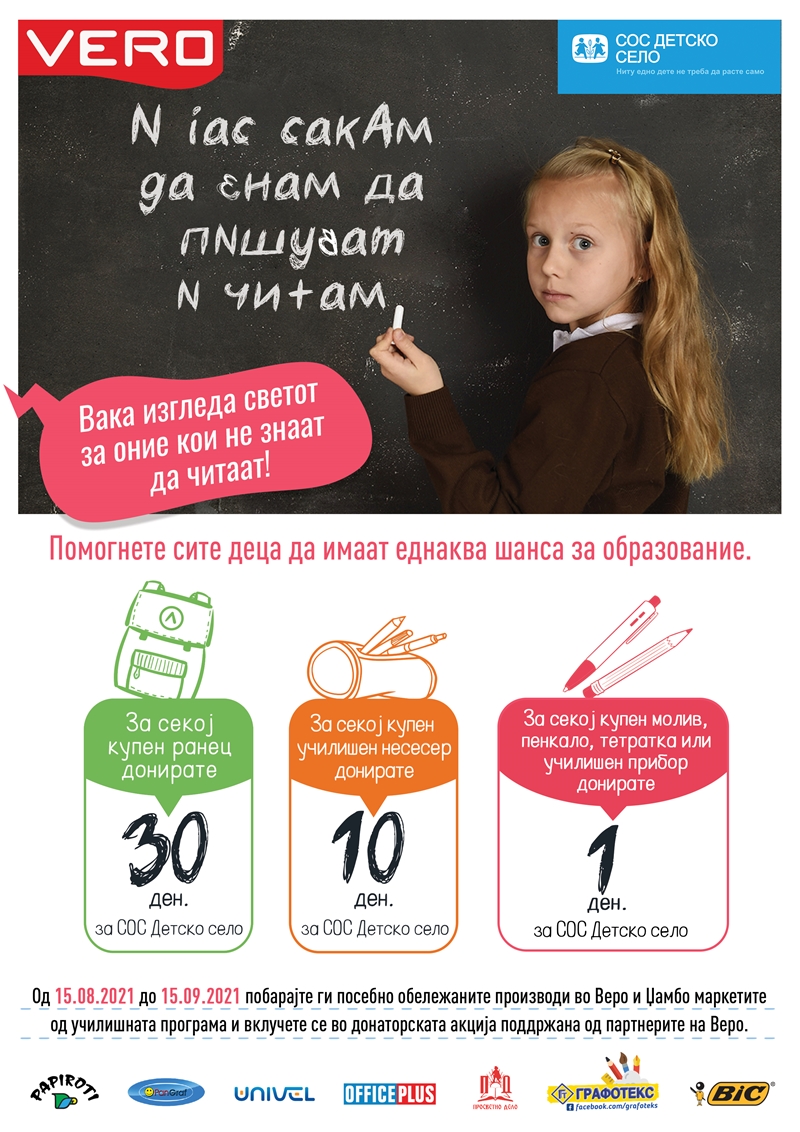 Хуманитарната акција може да ја поддржат сите граѓани преку купување на посебно означени производи од училишната програма во сите Веро маркети и Jumbo продавници. Во периодот од 15 август до 15 септември, за секој купен означен ранец се донираат 30 денари за СОС Детско село, за училишен несесер 10 денари, а за купување на секој означен молив, пенкало, тетратка или друг училишен прибор се донира по 1 денар. Сите средства од оваа донаторска акција се собираат во специјалниот фонд за СОС Детско село и се наменети за образовните потреби на децата без родители.