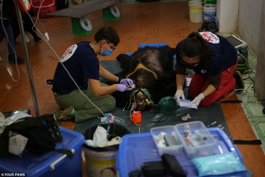 Вработените од „Четири шепи“ мораа да ги успијат мечките за да можат да бидат отстранети од кафезите, пред да извршат медицински прегледи.