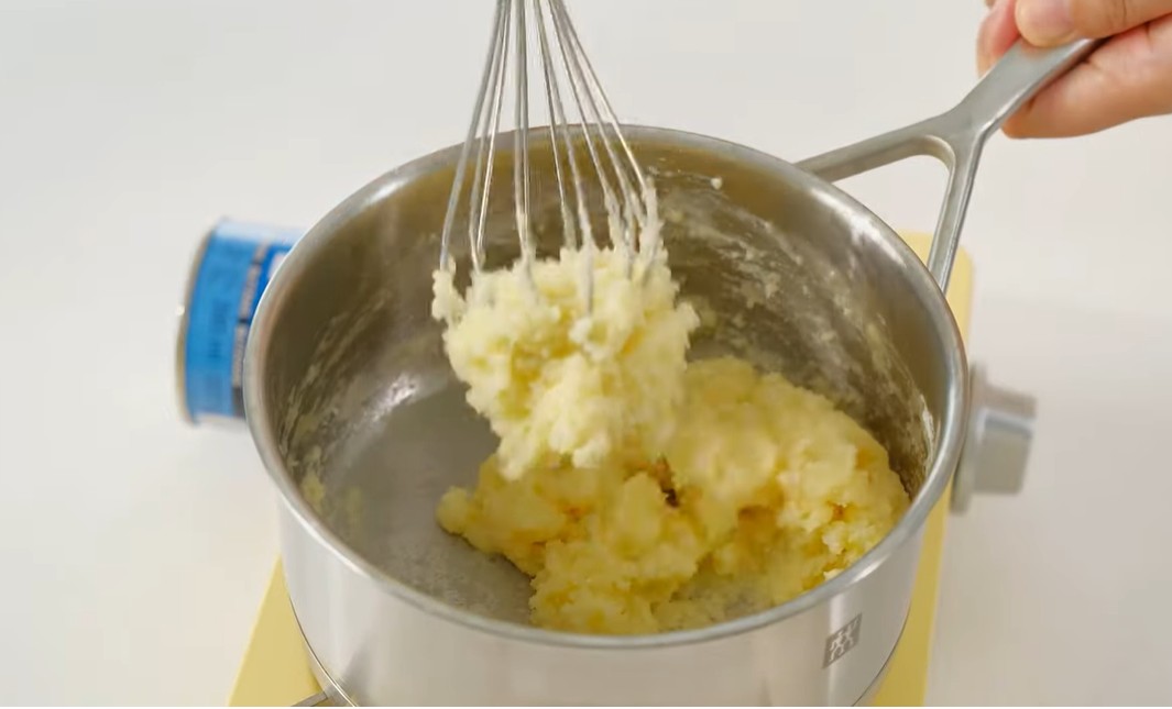Загрејте ја рерната на 190°C. Во тенџере соединете 180 грама вода, 90 грама путер, прстофат сол и прстофат шеќер, и загревајте додека путерот не се растопи и течноста не зоврие. Тргнете од оган, додајте 130 грама брашно и силно мешајте додека да добиете мазно тесто кое се одвојува од садот. Вратете на слаб оган и мешајте 1-2 минути. Оставете да се излади, потоа додавајте јајца едно по едно, со добро мешање, додека тестото не стане сјајно и густо, но да се лизга од лажица.