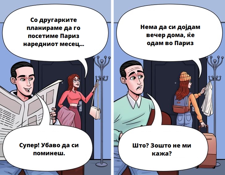 Ако паровите прават работи без консултација на пример земаат кредит за автомобил без знаење на едниот или одат на одмор без да се консултираат со партнерот тогаш ова е знак за неуспешен брак или врска.