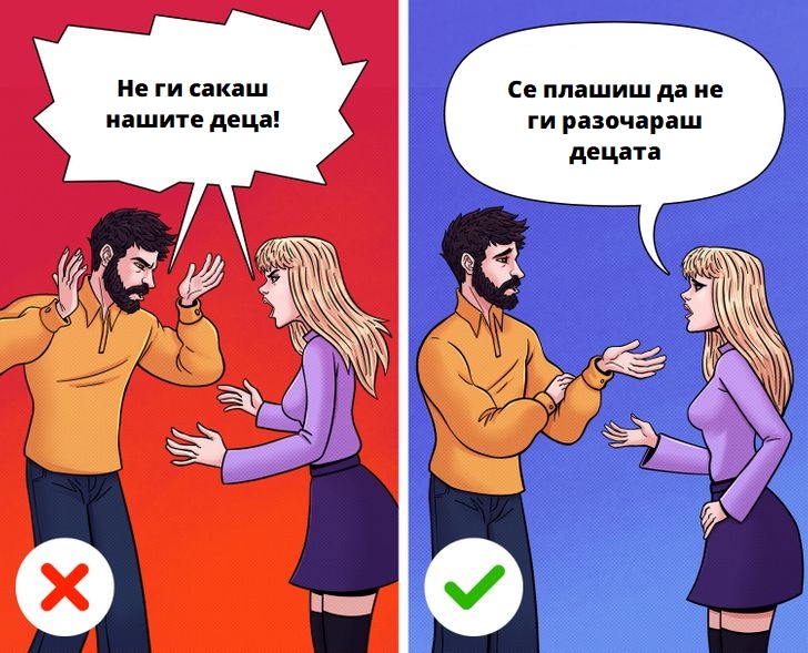 „Остануваме заедно за децата“. Ова доведува до нездраво размислување каде што парот гледа на децата како товар и верува дека останувањето во нездрава врска некако ќе ги натера децата да бидат во ред. Децата се попаметни отколку што мислите и ако нивните родители не се сакаат, тие ќе го знаат тоа.