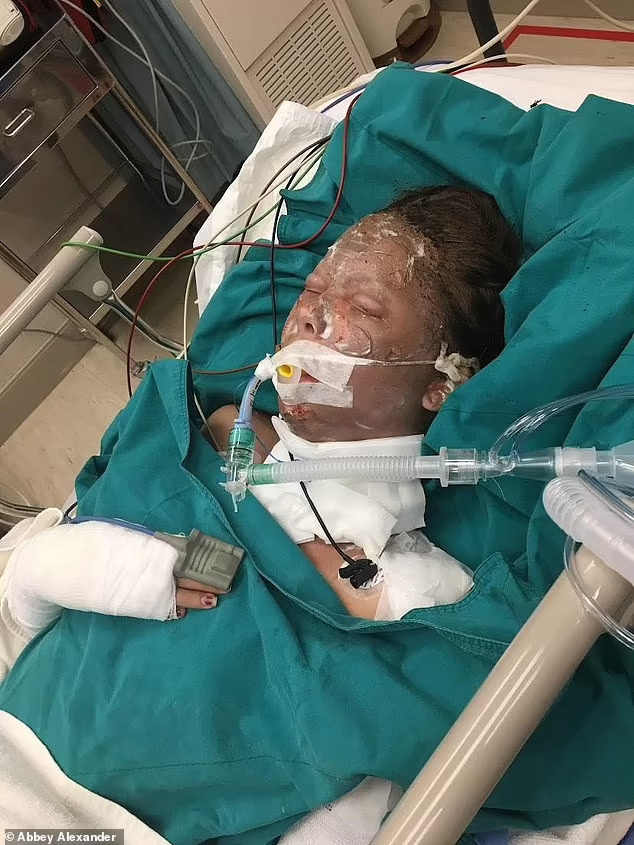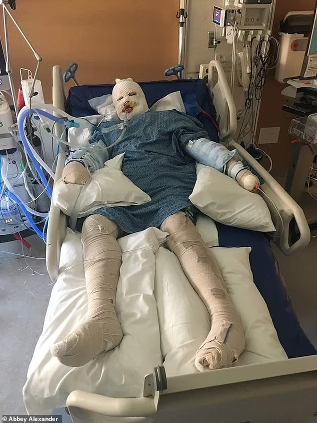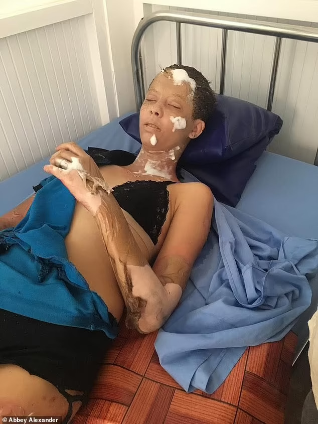 Шокантните слики ги покажуваат тешките изгореници на Аби и завоите што и го покриваат целото тело како последица на експлозијата во август 2019 година.