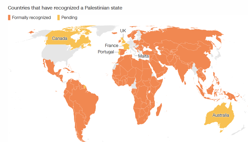 Австралија, Канада и Франција најавија дека ќе ја признаат Палестина на Генералното собрание на ОН во септември. Велика Британија исто така навестува признавање, но под услов Израел да се согласи на прекин на огнот во Газа. Овие потези дополнително ја зголемуваат изолацијата на САД во меѓународниот однос кон конфликтот.Ж