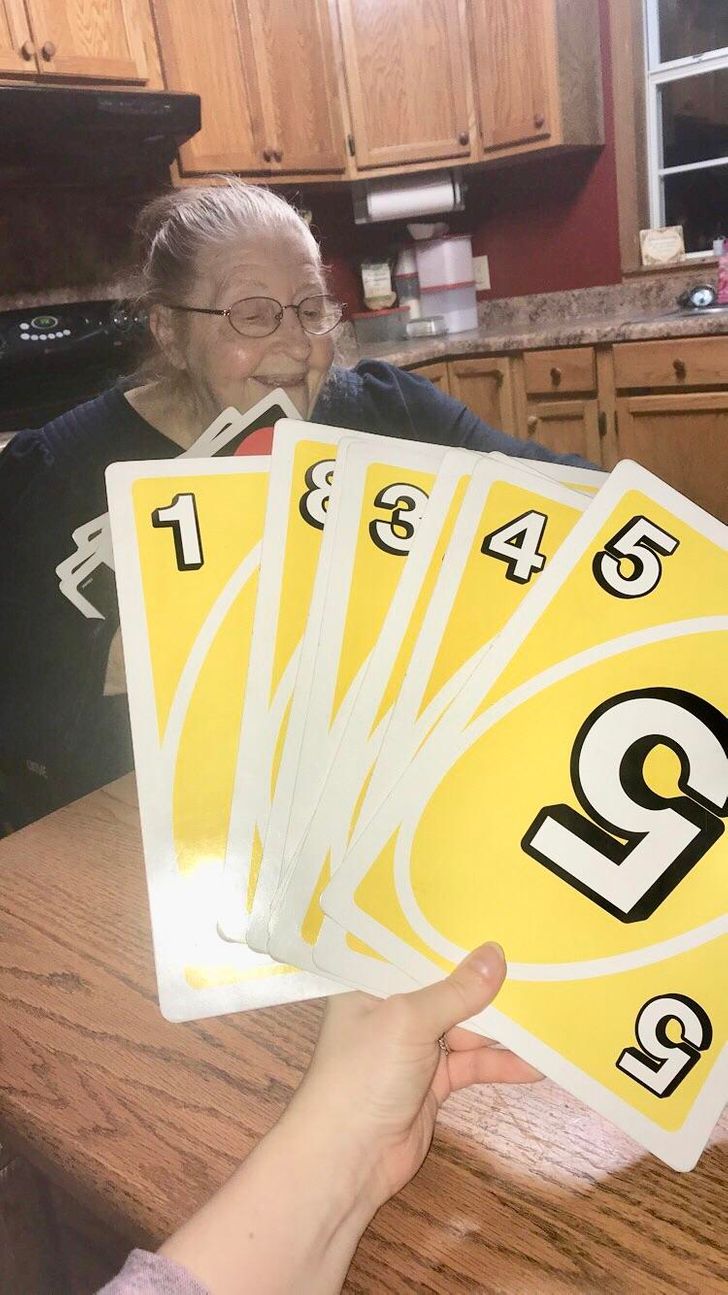 14. „Видот на баба ми се влошува и таа сака да игра игри на табла и карти. Тетка ми купи ги купи џиновските картички УНО за да може уште да игра “.