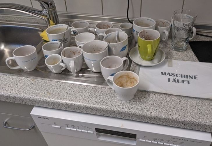 „Во нашата германска компанија, домарот секогаш објавува известување во кое стои: машината за садови работи. Таа го прави тоа за никој да не ја отвори случајно. Минатиот четврток, таа заборави да го отстрани известувањето. Така, до 15 часот во петок, еве како изгледаше нашата кујна.“