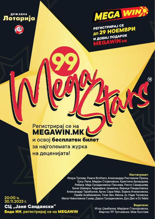 Зашто на 30 ноември среќата ќе биде насекаде! Токму таа, исто како и музиката, им дава душа на универзумот, крилја на умот, лет на имагинацијата, а магија и радост на нашите животи. Затоа разгалете си ги очекувањата и подгответе се МЕГАквалитетно и МЕГАуникатно искуство со добра македонска музика и една поинаква, позабавна лотарија − Државна лотарија, којашто за вас ги овозможи Мегавин и „99 Мегастарс “!