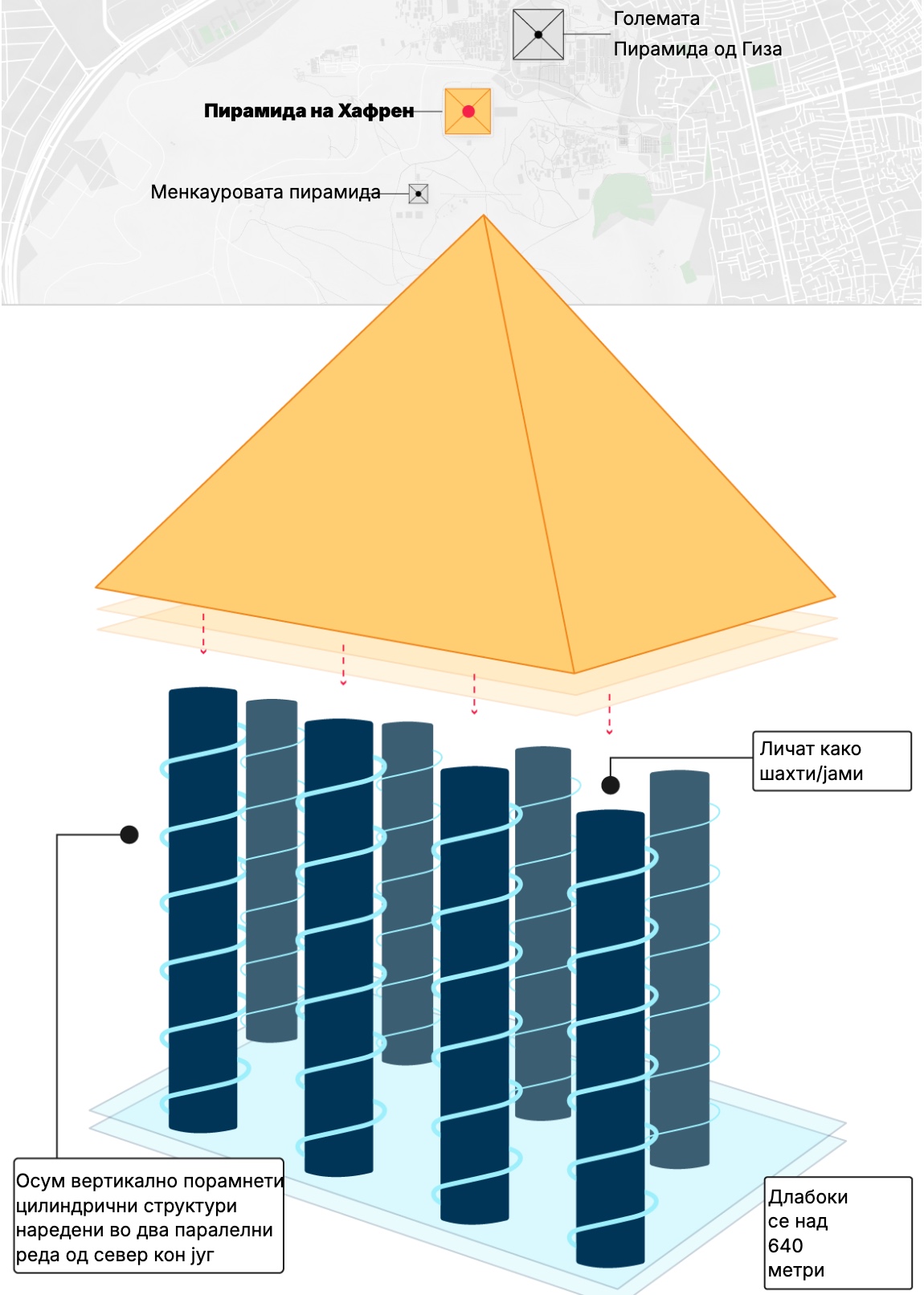 Снимките открија осум масивни шупливи цилиндри кои се спуштаат директно од основата на пирамидата на Хафра, средната од трите големи пирамиди во Гиза. Секој шахт содржи централна колона, совршено обвиена со спирални навивки, и завршува повеќе од 1.070 метри под платото, во кубни комори од 80 х 80 х 80 метри – поголеми од повеќето модерни спортски арени.